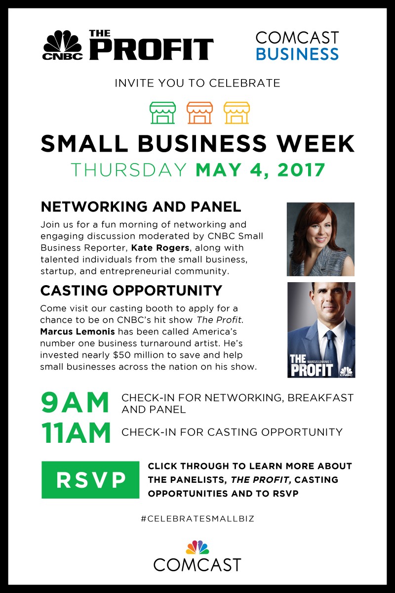 Join us for a fun morning of networking and engaging discussion moderated by CNBC Small Business Reporter, Kate Rogers, along with talented individuals from the small business, startup, and entrepreneurial community. Additionally, come visit our casting booth to apply for a chance to be on CNBC’s hit show The Profit. Marcus Lemonis has been called America’s number one business turnaround artist. He’s invested nearly $50 million to save and help small businesses across the nation on his show.